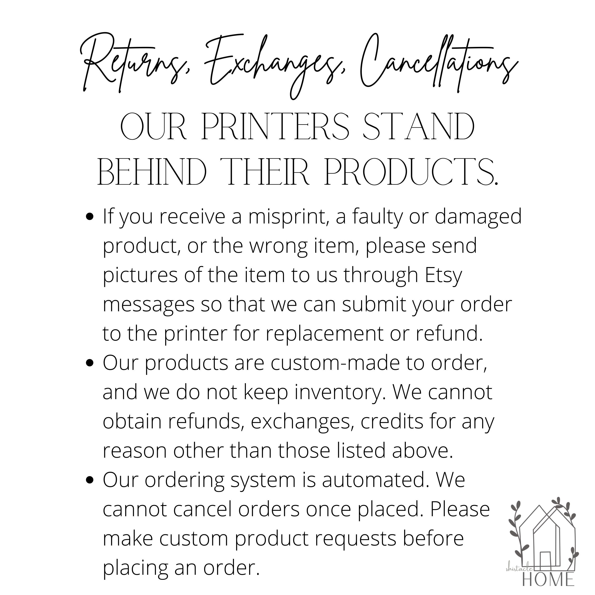 ✔ Returns: Our products are all made to order, and we don't keep inventory. We are unable to offer refunds or exchanges for this reason.